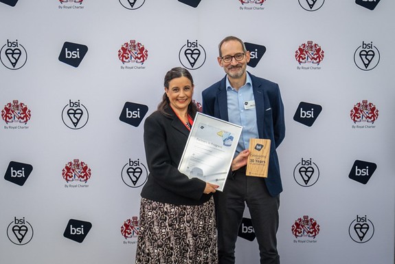Nikki Porter, Group CEO of PHSC plc, receiving the certificate from Matt Page, Senior Vice President, EMEA Assurance at BSI, during BSI’s Celebration Day event.